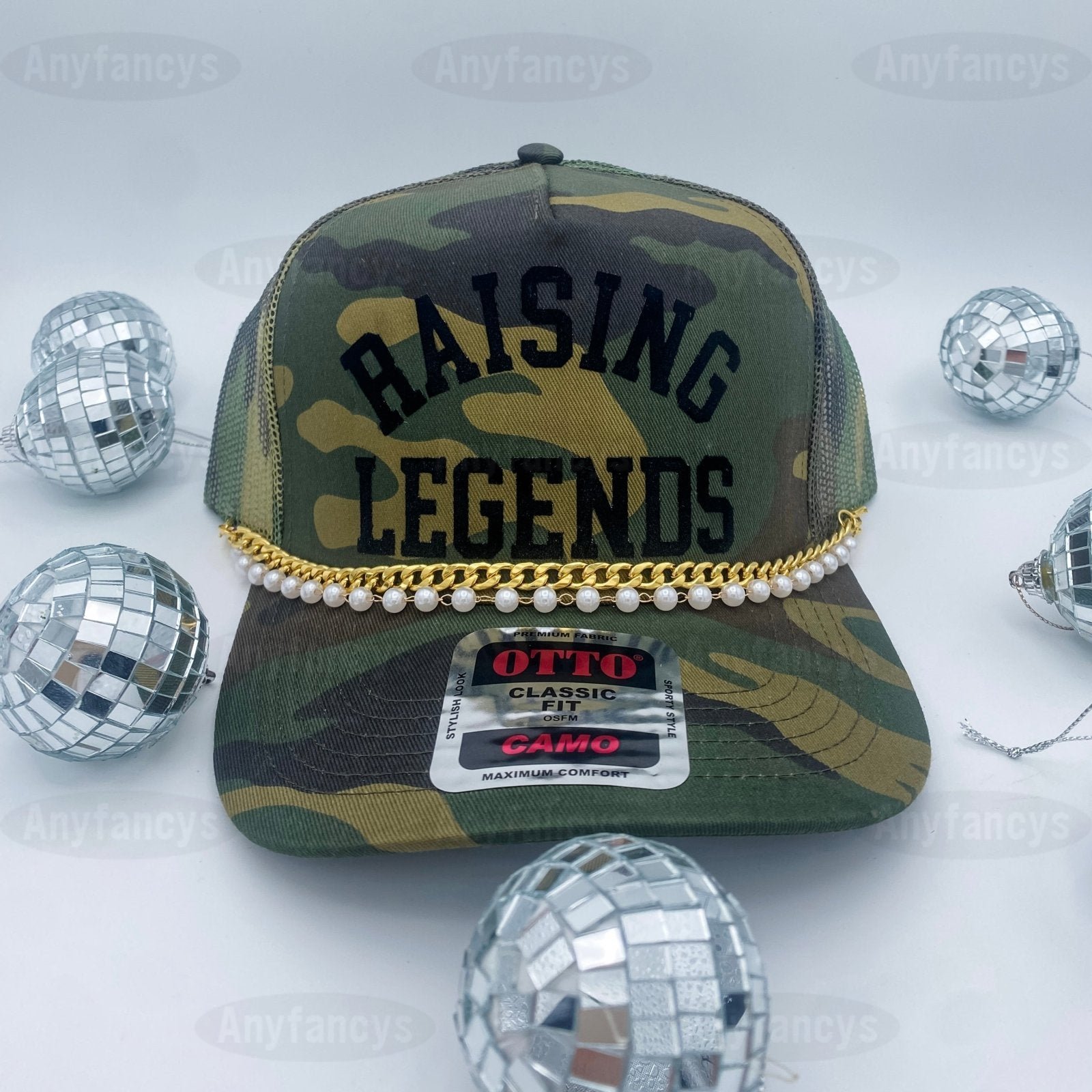 The Coco & Rho Original Raising Legends Camo Trucker Hat is a staple for everyone. Adorned with a gold and pearl chain. The lettering is a soft velvet that gives it a raised and elevated look and feel. This is a Camo Trucker Hat with a mesh back and adjustable strap for universal sizing!